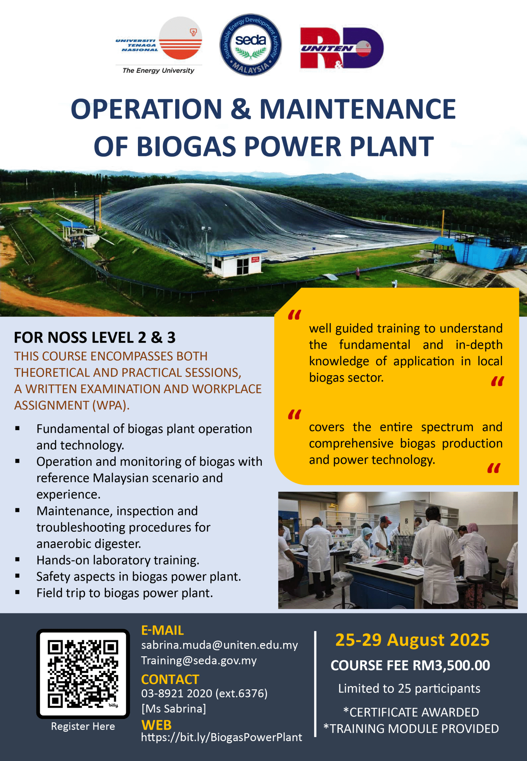 SEDA Malaysia provides training on “Operation & Maintenance of Biogas Power Plant Course” specifically for Operator and Supervisor level. The 5-day course encompasses both theoretical and practical sessions, a written examination and Workplace Assignment (WPA) (a specific duration to complete the WPA will be determined).
